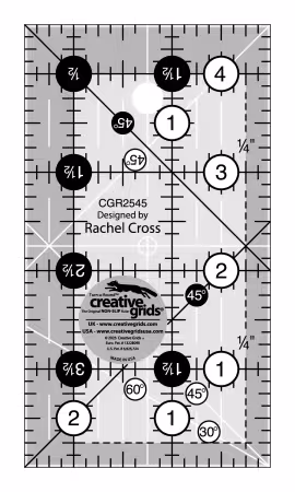 This 2-1/2in x 4-1/2inch rectangle ruler from Creative Grids® is the perfect choice for anyone who loves to work with the 2-1/2in precuts on the market today. Also great for trimming up smaller projects.
