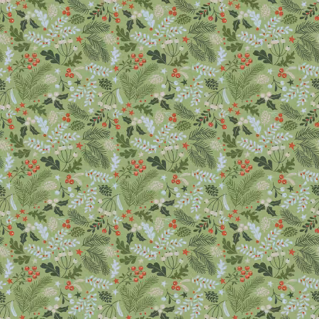 This fabric features a charming holiday design with a green background adorned with various festive elements such as berries, boughs, and stars. The pattern includes an array of pine branches, holly leaves, and small red berries, creating a festive and natural look perfect for holiday crafting or seasonal decor. The design is detailed and colorful, bringing a touch of Christmas cheer to any project.